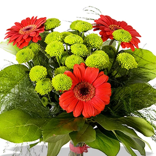 Стильно подобранная цветовая гамма и уникальный коллаж цветов! Композиция из гербер, хризантем и декоративной зелени, действительно универсален! Букет удивит как солидного юбиляра, так и любимого артиста. И, конечно же, будет приятным сюрпризом на первом свидании и станет отличным утренним подарком любимой, который разбудит ее, подарив превосходное настроение.