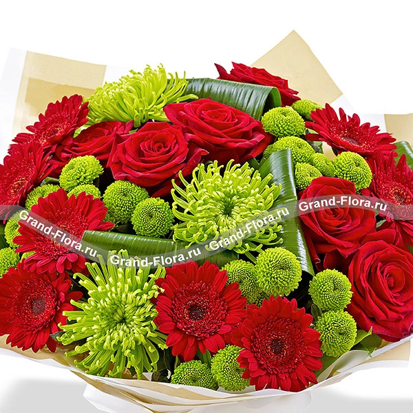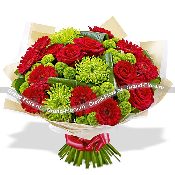Стандартный: роза красная - 5 шт., гербера красная - 3 шт., хризантема одноголовая зеленая (шамрок) - 2 шт., хризантема зеленая сантини - 1 шт., лист аспидистры - 3 шт., фетр кремовый, бант красный.